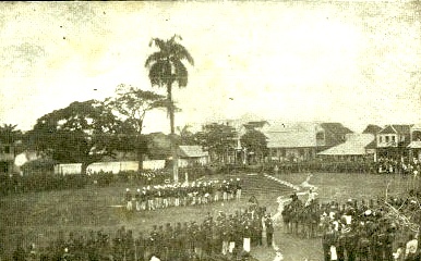 (Postcard showing a military review in Les Cayes.<br> Publisher: W. Bonnefil (1910's) '''Caption''': Les Cayes, Haïti - Une Revue sur la Place d'Armes.) |