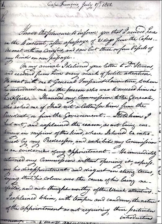 1801 letter by Tobias Lear the newly appointed U.S. Consul General to Saint-Domingue, reporting about a meeting with Toussaint Louverture.