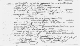 | current | 05:58, 18 July 2006 | 821 × 479 (146 KB) | Doe (talk | contribs) | The Death certificate (''Acte de Décès'') of Toussaint Louverture, signed by Amiot, the commander of Fort de Joux, the French prison where Toussaint died. Toussaint Louverture died on April 7, 1803. |